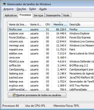 Então, pressione CTRL ALT DEL para entrar no Gerenciador de Tarefas do Windows. Em processos você vê o que está rodando no computador e quanta memória está exigindo. Vá em aplicativos e veja se algum programa está marcado como "Não rodando (Not running)". Clique sobre ele e, então, em finalizar. Faça isso também com os aplicativos que estão rodando em segundo plano ou com aqueles que consomem muita memória. Lembre-se, apenas, que se você fechar um programa, você pode perder tudo que estava fazendo.